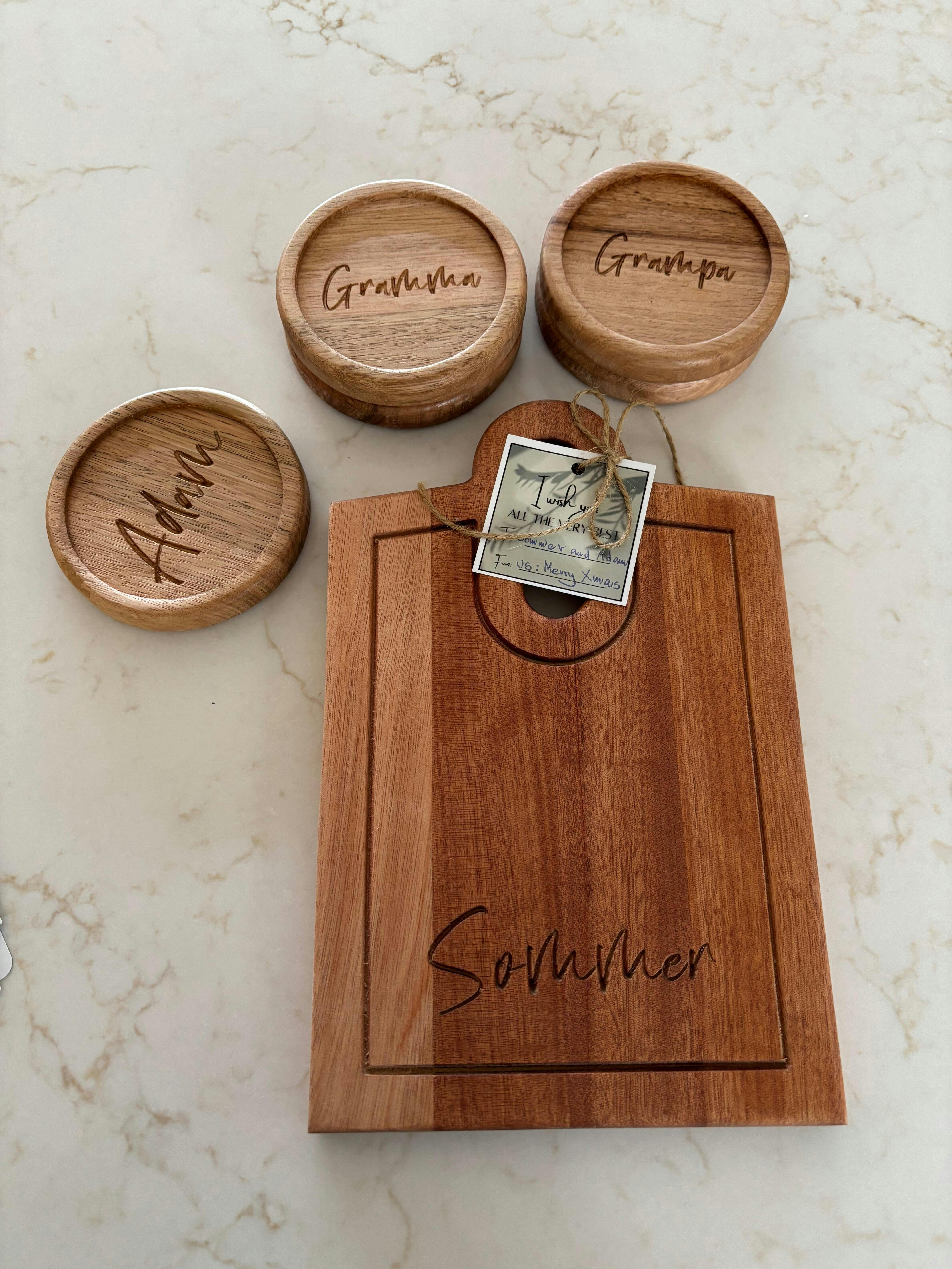 Looking for a unique and personalised way to protect your surfaces while adding a touch of charm to your home? Look no further than our beautiful wood coasters featuring personalised names!