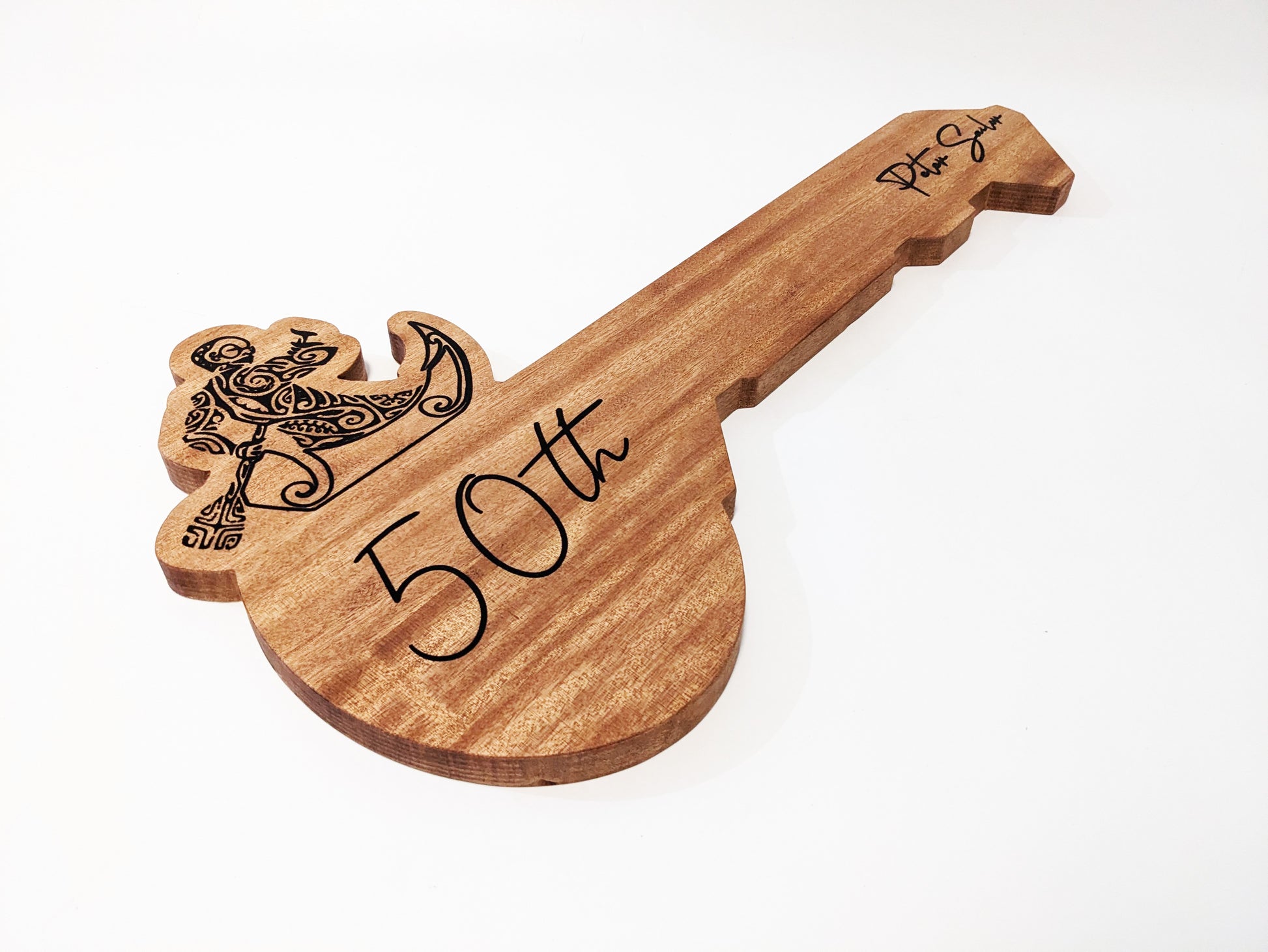 A milestone birthday party key in wood style. This unique celebration will become a treasured memento of your special occasion for years and years to come. It's practical, functional and fashionable, let it take centre place at your special event. This makes it a truly special artwork of an event you'll never want to forget. The key is crafted from hardwood, engraved and finish with epoxy details. The epoxy provides a beautiful backdrop for the engraved details, which include the recipient's name and birth date. Personalise the keys with a person's name and small message if you wish.