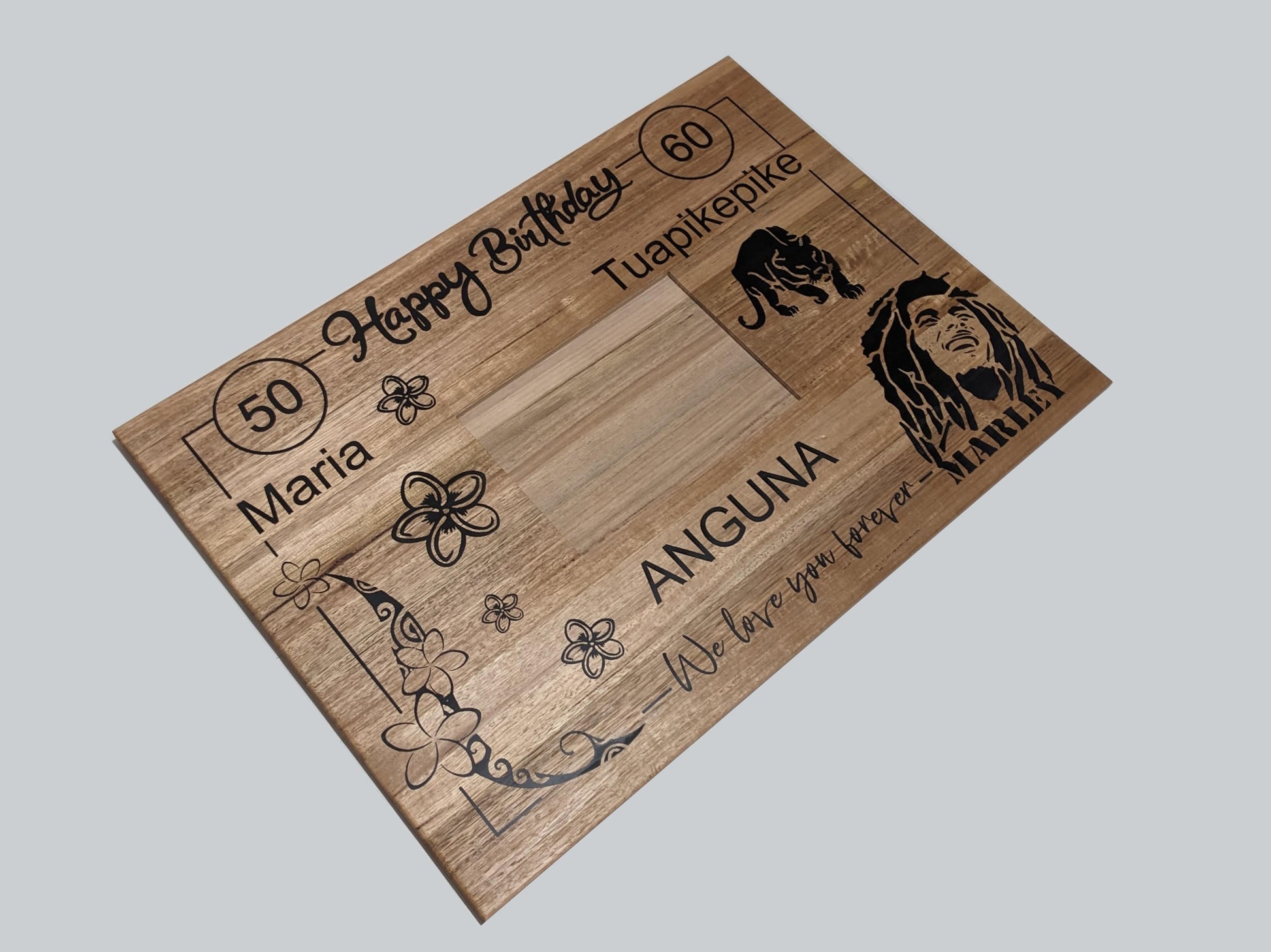 This one-of-a-kind piece is crafted from premium hardwood, chosen for its natural beauty and durability. The design features your selected photo(s) and personalised details, making it a truly special tribute to the person you're celebrating. Key elements are carefully engraved into the wood and filled with coloured epoxy, adding depth, contrast, and a polished finish that brings the design to life.